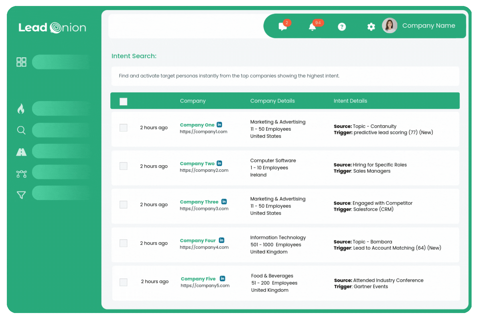 Lead Onion combines Company, Person, and Website Intent signals into one premium intent platform — so you’re not just targeting accounts, you’re connecting with real buyers as they move through their journey.